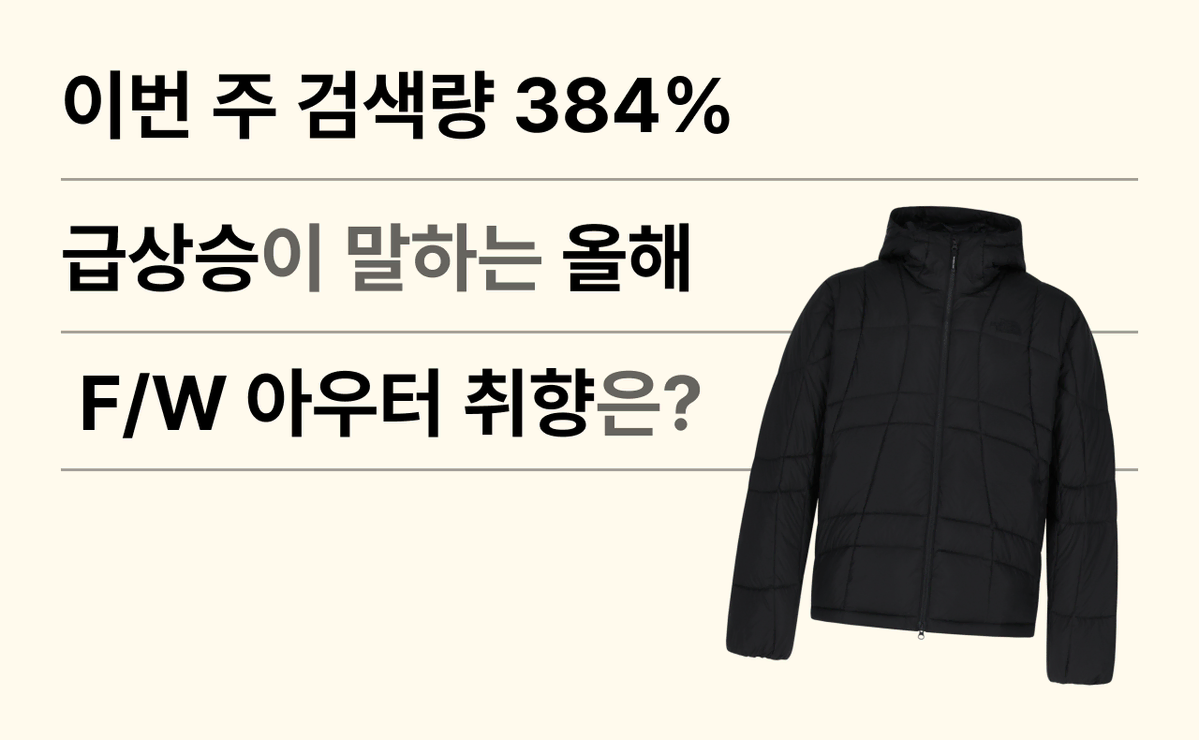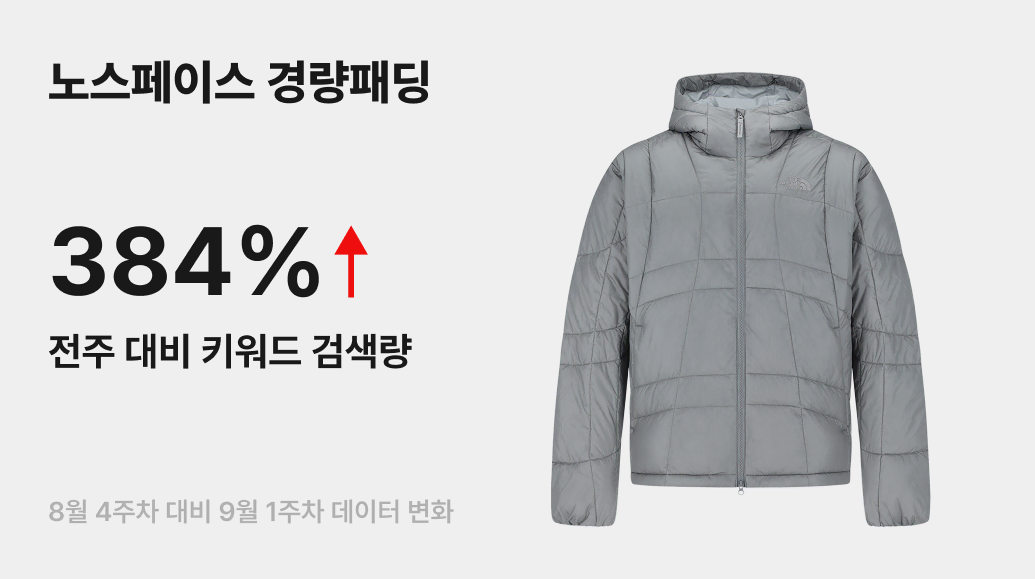 선선한 바람이 가을의 시작을 알리는 요즘, 번개장터에서 아우터를 준비하는 사람들이 하나둘 늘고 있어요. 특히 지난주 위클리 취향 리포트에서 예측한 대로, 경량패딩의 인기가 벌써부터 심상치 않습니다. 그중에서도 ‘노스페이스 경량패딩’ 키워드 검색량이 전주 대비 384% 급상승하며, 아우터 대표 브랜드답게 F/W 시즌의 신호탄을 쏘아올렸어요.