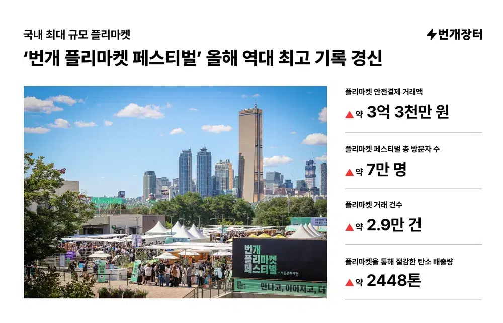 (2025년 9월 26일) 한국 대표 테크 리커머스(recommerce) 플랫폼 번개장터(대표 강승현·최재화)가 지난 9월 20일과 21일 양일간 서울문화재단과 협력하여 개최한 ‘2025 번개 플리마켓 페스티벌’이 역대 최고 흥행 기록을 경신하며 성황리에 막을 내렸다. 서울 노들섬에서 열린 이번 행사는 약 7만 명 이상의 누적 방문객을 기록하며, 지난해 대비 5배 이상 성장하는 폭발적인 인기를 입증했다. 행사 양일 모두 시작 5시간 전인 오전 7시부터 대기 행렬이 이어질만큼 뜨거운 관심 속에서 진행됐다.