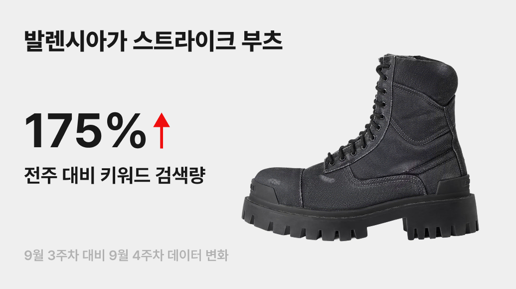 가을이 오고 날씨가 선선해지자 발렌시아가(Balenciaga)의 ‘스트라이크 부츠(Strike Boots)’가 다시 떠오르고 있어요. 번개장터에서 ‘발렌시아가 스트라이크 부츠’ 키워드 검색량이 전주 대비 175% 증가하며, 하우스의 상징적인 아이템에 대한 관심이 뜨겁다는 것을 보여주고 있죠. 묵직하고 투박한 아웃솔이 주는 강력한 존재감은 스트리트와 럭셔리의 경계를 허문 발렌시아가의 정체성을 상징합니다.