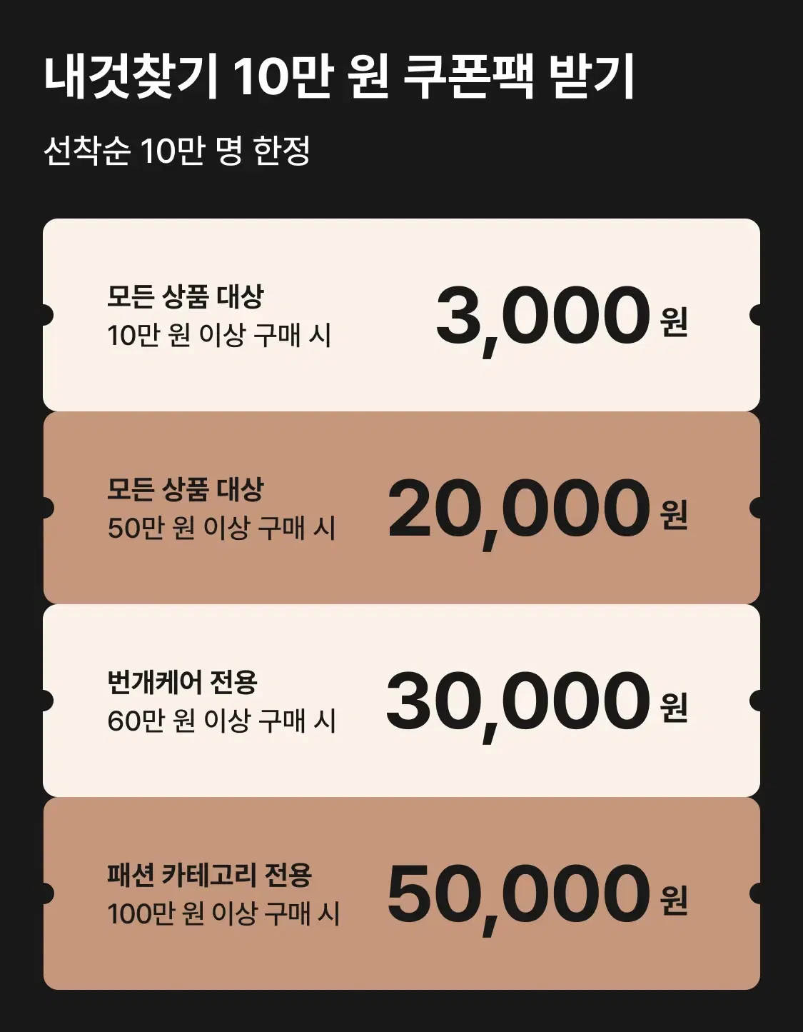 첫번째 혜택으로 10만 원 쿠폰팩을 준비했어요. 무려 선착순 10만 명에게 제공되는 파격적인 쿠폰팩으로, 누구나 부담 없이 ‘내것’을 찾고 거래할 수 있도록 아낌없이 지원해 드려요.