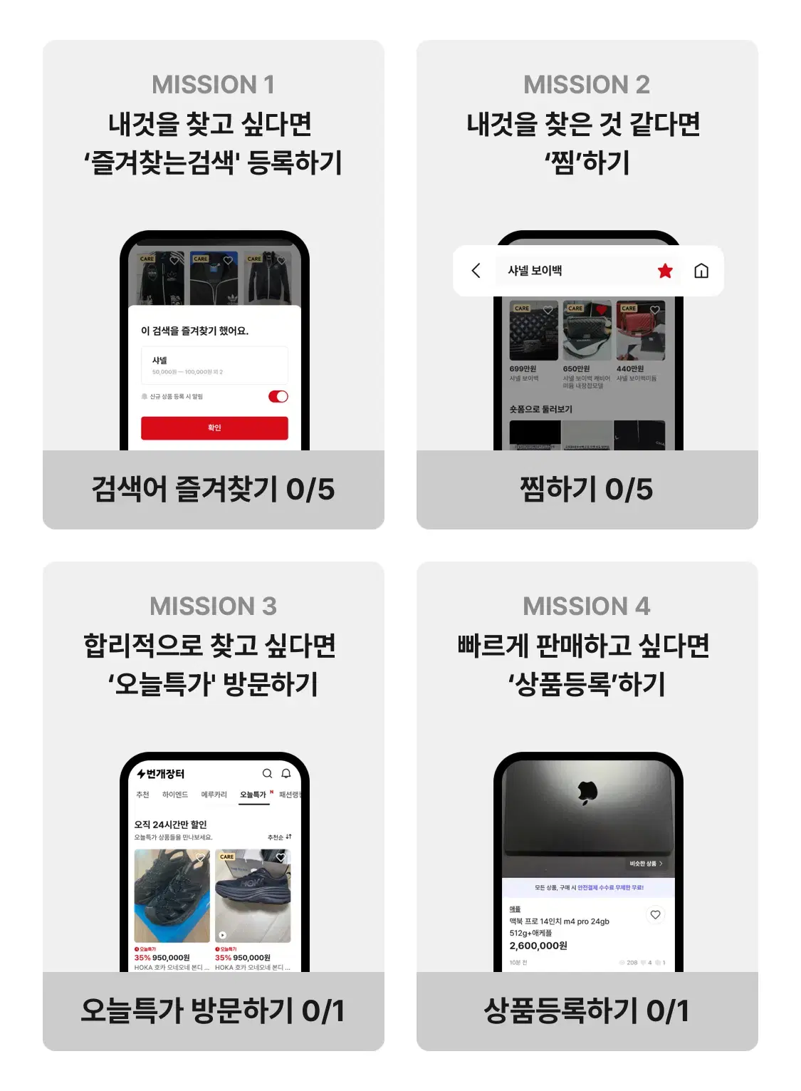 세번째는 번개장터를 더욱 쉽고 편리하게 이용하는 방법을 경험할 수 있는 ‘내것찾기’ 미션입니다. 4가지 미션을 통해 번개장터에서 쉽고 빠르게 사고파는 법을 직접 경험하고, 총 8만 원 상당의 혜택도 받아가세요.