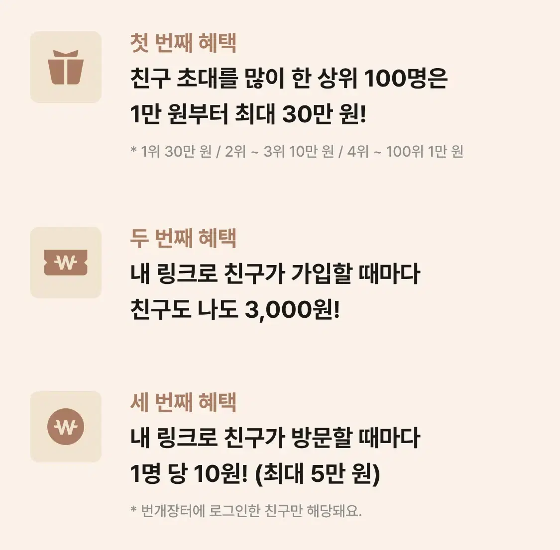 - 혜택 3: 내 링크를 통해 친구가 방문할 때마다 1명당 10원씩, 최대 5만 원의 번개포인트를 드려요.