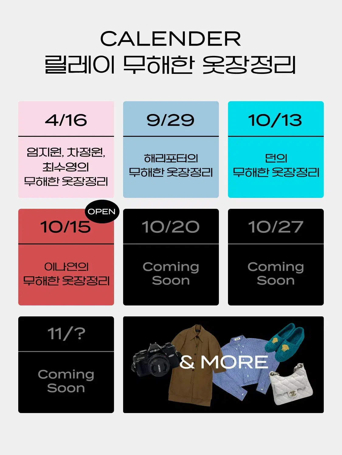 엄지원, 차정원, 최수영에 이어 해리포터, 던, 이나연까지 이어진 <릴레이 무해한 옷장정리>. 과연 다음 무해한 옷장정리의 주인공은 누굴까요? 앞으로 한 달간 이어질 릴레이 무해한 옷장정리를 만나보고 싶다면, 지금 아래 버튼을 눌러 번개장터 앱에서 확인해 보세요.