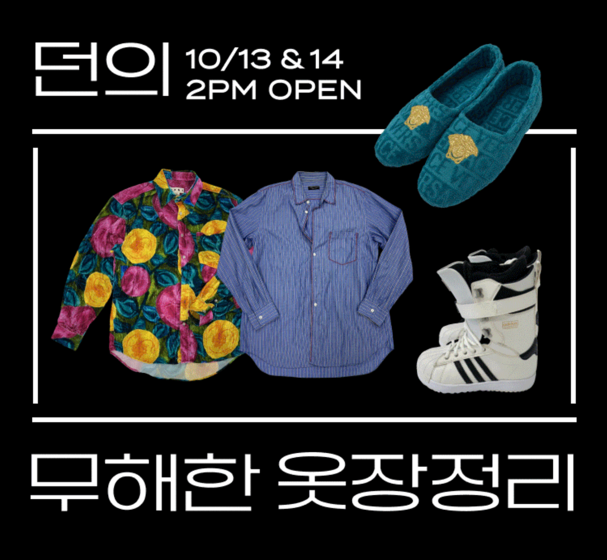 아티스트 던은 9월 29일 - 10월 1일에 진행된 무해한 옷장정리에서 뮤직비디오에서 착용한 아디다스 신발, 아크네스튜디오, 마르니 상의 등 12종의 아이템을 판매했어요. 또한 직접 그린 그림을 드로우로 내놓는 등 물건에 담긴 특별한 사연을 나눴죠. 던뿐만 아니라 앞으로 더 다양한 이들이 무해한 옷장정리와 함께할 예정이니 지금 번개장터 앱에서 만나보세요.