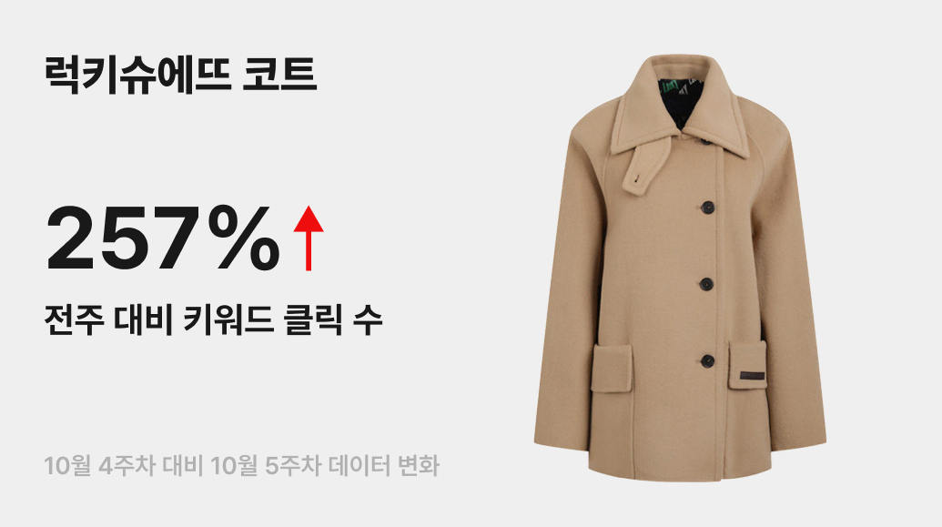 어느덧 매서운 칼바람이 불어오는 요즘, 여성 캐주얼 브랜드 ‘럭키슈에뜨(Lucky Chouette)’의 코트가 주목받고 있어요. 럭키슈에뜨는 지난 여름에도 키치한 매력의 프린팅 반소매 티셔츠를 선보이며 뜨거운 인기를 끌었던 적 있는데요. 이번 주 번개장터에서 ‘럭키슈에뜨 코트’ 키워드 클릭 수가 전주 대비 257% 급상승하며, 계절에 상관없이 개성 있는 세련미를 선호하는 이들의 취향을 저격하고 있죠.