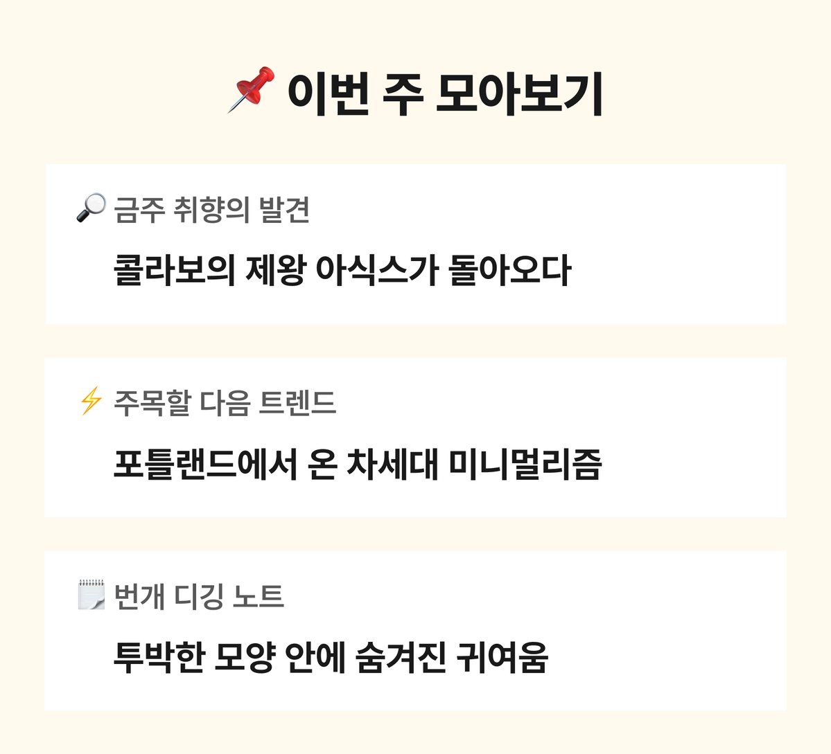 트렌드는 금세 뜨고 쉽게 사라집니다. 하지만 취향은 다르죠. 시간 속에 쌓이고, 변하며, 다시 돌아오기도 합니다. 매일 수백만 건의 거래가 이루어지는 번개장터, ‘좋아했던 것’과 ‘지금 좋아하는 것’이 수없이 교차하는 이곳에서는 취향의 흐름을 가장 선명하게 볼 수 있어요. 이번 리포트에선 지난주 급상승 키워드를 통해 지금 소비에 담긴 취향의 변화를 살펴봅니다.