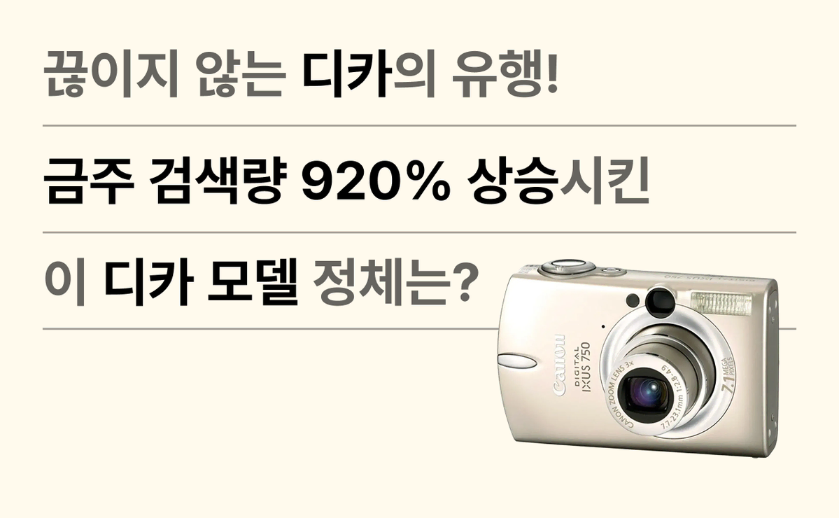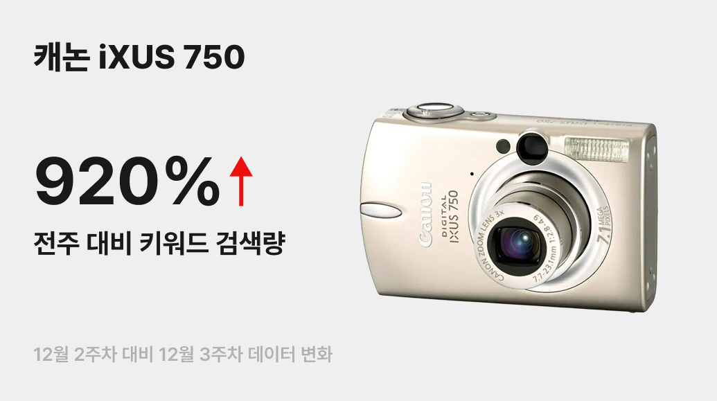 레트로 감성이 지속되며 일회용 카메라를 넘어 디지털 카메라의 유행도 이어지고 있습니다. 이러한 흐름 속에서 금주 번개장터에서는 ‘캐논 익서스 750’ 모델이 급부상했어요. 관련 검색량이 전주 대비 920% 증가한 1,163건을 기록하며 뜨거운 관심을 증명했는데요.