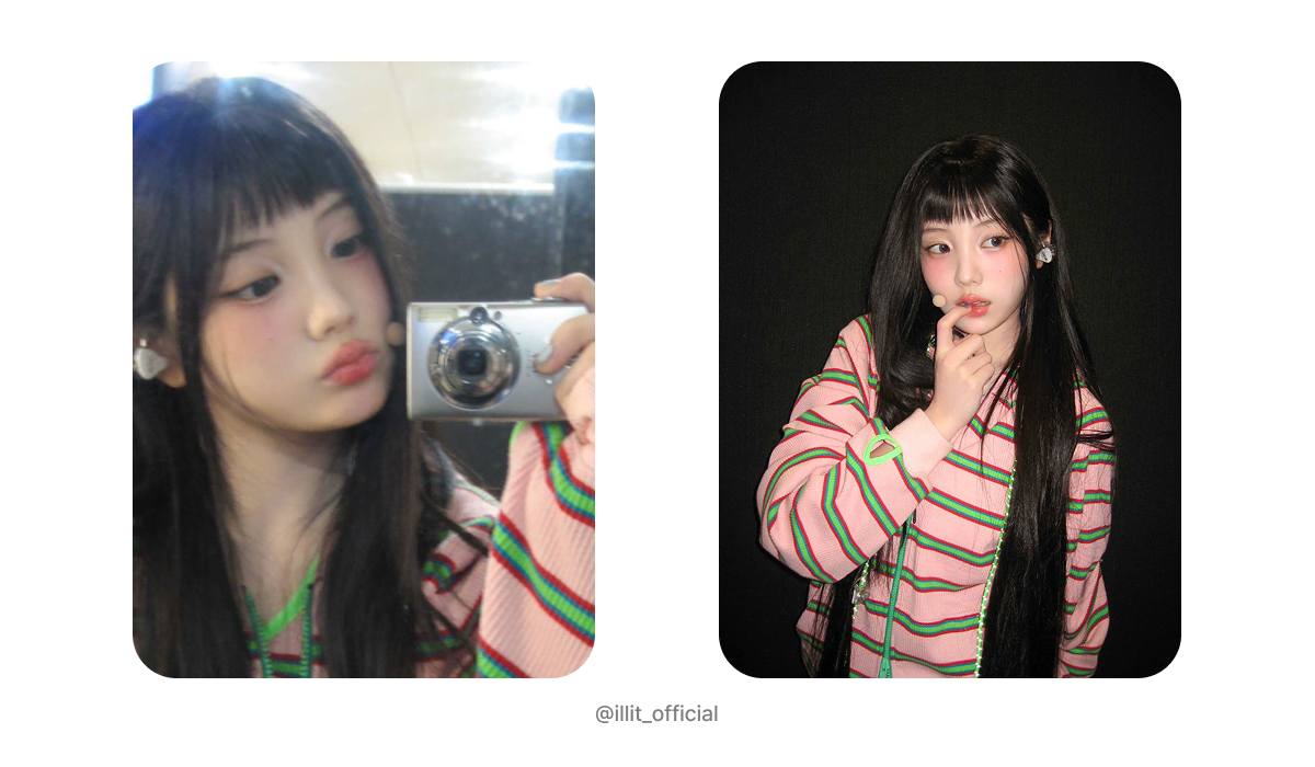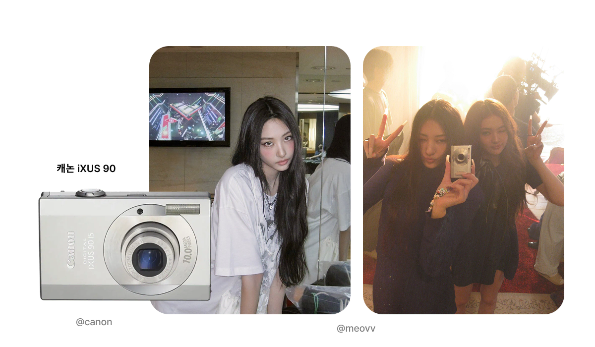 먼저 아일릿 이로하가 사용하는 모델인 ‘캐논 익서스 70’입니다. 강민경이 사용하는 카메라로도 잘 알려져 있는데요. 전반적으로 채도가 낮고 부드러운 톤이 강조되어 피부 표현이 자연스럽게 연출되는 것이 특징이에요. 특히 플래시를 사용했을 때 특유의 빈티지한 무드가 살아나 셀카는 물론, 감성적인 일상 기록용 카메라로 잘 어울린답니다.