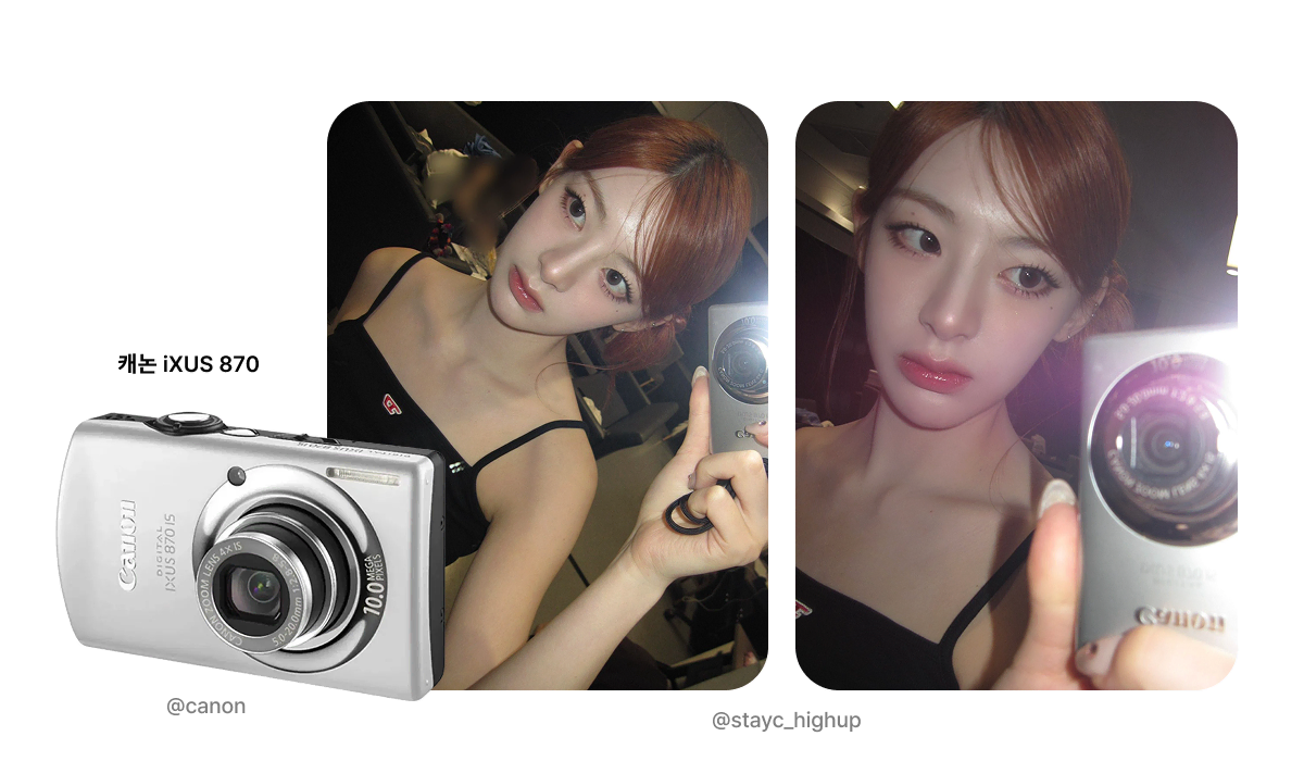 마지막으로 스테이씨 세은이 사용하는 모델, ‘캐논 익서스 870’이에요. 네 모델 중 가장 또렷한 결과물을 보여주면서도, 플래시와 함께 사용할 때 디카 특유의 무드가 잘 살아납니다. 인물 중심의 셀카나 또렷한 인상을 남기고 싶은 사진에 잘 어울리는 모델이에요.