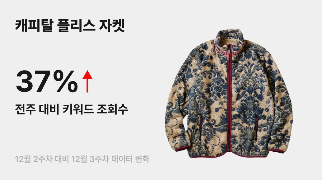본격적인 겨울 추위가 시작되면서 플리스 자켓과 같은 레이어드 아우터에 대한 관심이 빠르게 높아지고 있습니다. 실내에서도 보온을 유지할 수 있는 인도어·아웃도어 겸용 아이템을 찾는 수요가 늘어나고 있는데요. 실제로 번개장터 내 캐피탈 플리스 자켓 관련 키워드 조회수가 전주 대비 37% 증가하며 이러한 흐름을 입증했어요.