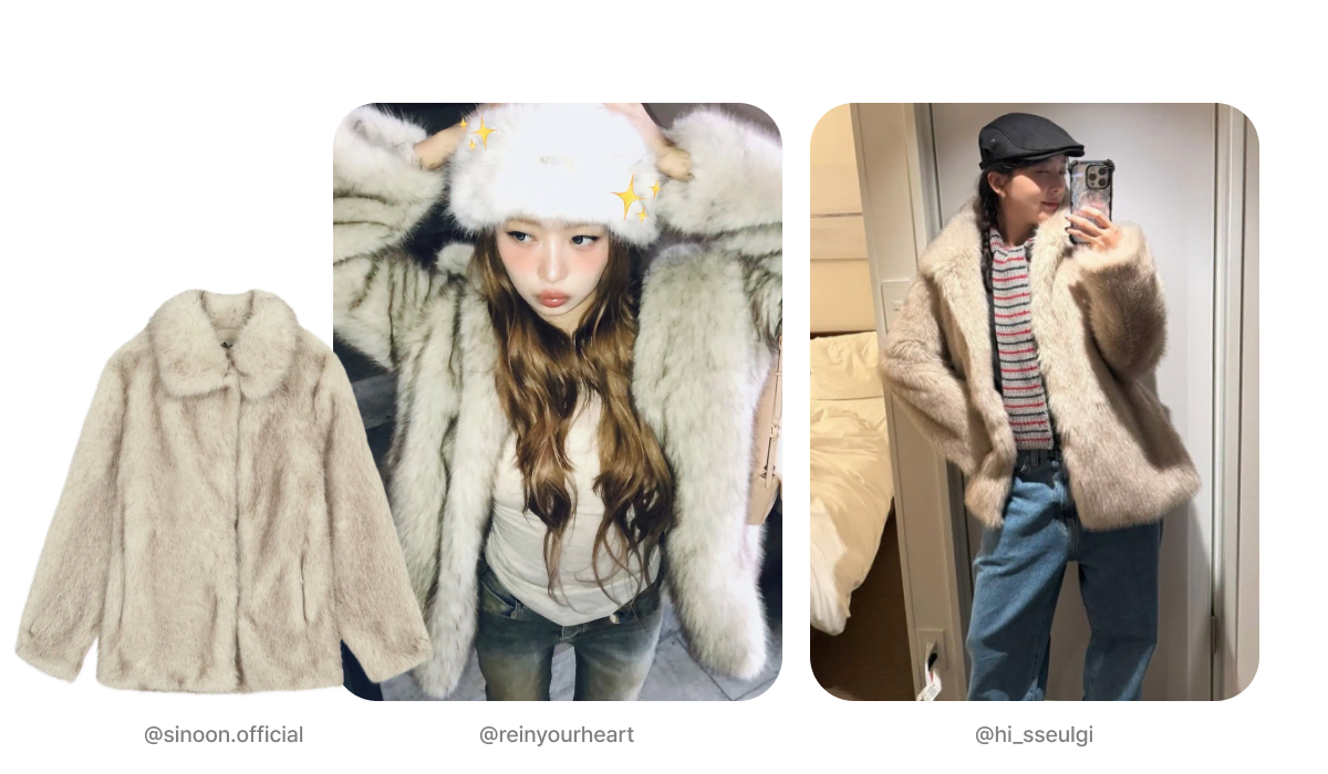 셀럽들이 선택한 퍼 자켓으로는 시눈(Sinoon)의 ‘헤비 믹스 퍼 자켓’이 있습니다. 번개장터에서 ‘시눈 퍼’ 클릭량이 전주 대비 58% 증가함과 동시에, 레이와 슬기가 해당 제품을 착용하며 큰 인기를 모았는데요. 은은한 투 톤 에코 퍼와 매트한 텍스처가 고급스러움을 살리며, 스트레이트 핏과 엉덩이를 덮는 하프 기장으로 한겨울에도 부담 없이 착용할 수 있어요. 빈티지 퍼에서 영감을 받은 카라 디테일은 보온성과 스타일을 동시에 만족시켜, 페미닌하면서도 클래식한 무드를 완성합니다.