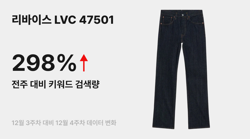 최근 와이드 핏의 대안으로 담백한 레귤러 핏 데님이 주목받고 있습니다. 그중에서도 가장 완벽한 핏이라고 불리는 리바이스(Levis)의 빈티지 클로딩 라인 ‘LVC 47501’의 수요가 급증했는데요. 빈티지 패션에 대한 관심이 높아진 것도 데님이 주목받는 이유 중 하나죠. 실제로 번개장터 내 관련 키워드 검색량이 전주 대비 298% 증가하며 이러한 관심을 입증했어요.