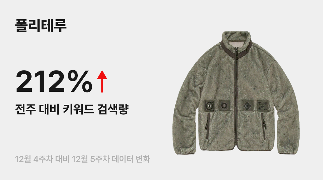 국내 패션 신에서 탄탄한 팬덤을 보유한 폴리테루(POLYTERU)가 올겨울 시즌 뚜렷한 존재감을 드러내고 있어요. 매주 공개되는 겨울 신규 라인업마다 감도 높은 디자인으로 주목받고 있는데요. 그 영향력을 보여주듯, 금주 번개장터 내 ‘폴리테루’ 검색량이 전주 대비 212% 증가하며 높은 관심도를 기록했습니다.