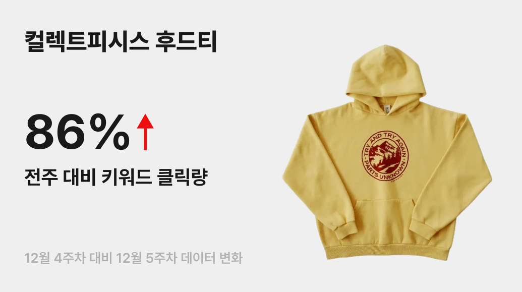 익숙한 레퍼런스를 자신들만의 방식으로 재조합해 풀어내는 브랜드, 컬렉트피시스(COLLECT PIECES)의 약진이 매섭습니다. 담백한 레터링과 빈티지한 컬러감을 바탕으로 두터운 팬층을 꾸준히 쌓아오고 있는데요. 이러한 흐름을 입증하듯, 금주 번개장터에서 컬렉트피시스의 클릭량이 전주 대비 86% 증가하며 뚜렷한 상승세를 기록했어요.