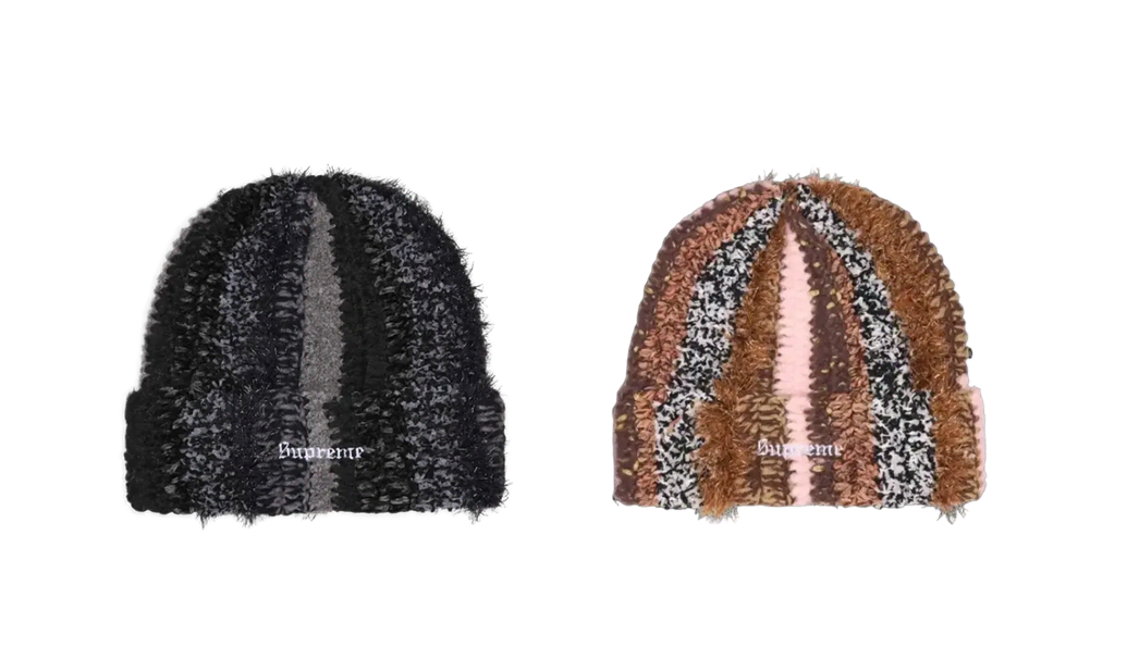 특히 이번 시즌에는 복슬복슬한 털 텍스처가 돋보이는 ‘틴셀 스트라이프 비니’를 주목해 보세요. 다양한 컬러가 스트라이프 패턴으로 믹스되어 단조로운 겨울 룩에 자연스럽게 포인트를 더해주며, 연말 분위기와도 잘 어울리는 아이템이에요. 보송한 텍스처 사이로 보이는 슈프림 로고가 스트릿 무드를 더해주죠.