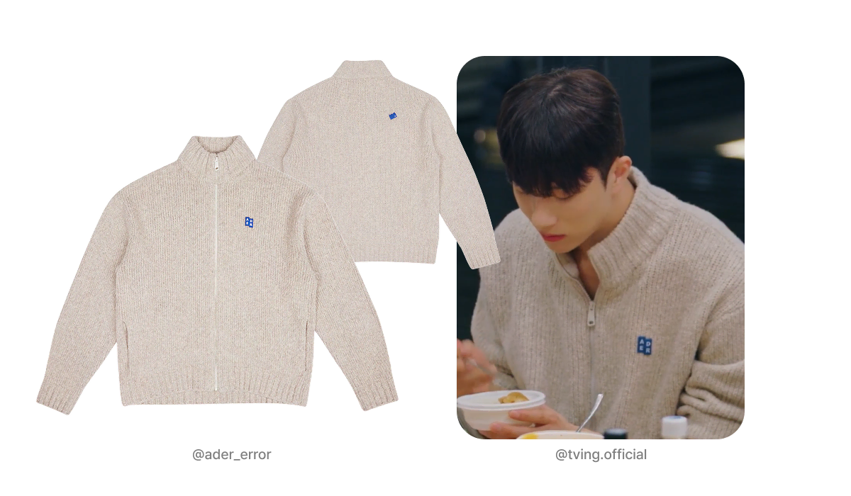 많은 아이템 중, 특히 주목받고 있는 모델이 바로 ‘아더에러 TAG 니트 집업’ 오트밀 컬러입니다. ‘환승연애4’ 17-18화에서 조유식이 입고 나오며 큰 화제를 모았는데요. 포근한 오트밀 컬러에 시그니처 블루 태그가 포인트로 더해져, 심플하지만 확실한 존재감을 주는 것이 특징이에요. 계절에 따라 아우터나 이너로 다양하게 활용할 수 있어, 자연스러운 남친룩을 연출하고 싶다면 제격인 아이템입니다.