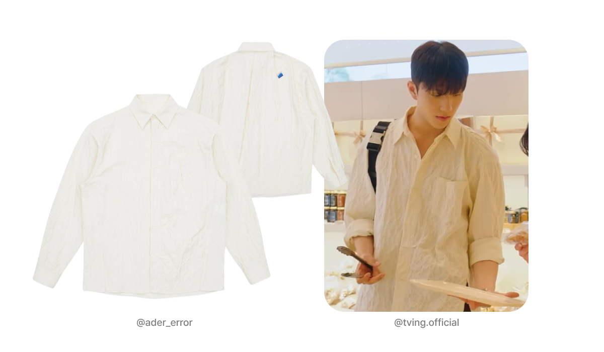 먼저 조유식이 가장 자주 착용한 모델인 ‘EDIS 셔츠’입니다. 데일리룩이나 데이트할 때 자연스럽게 매치하며 시청자들에게 눈도장을 찍었는데요. 일반적인 셔츠와 달리 전체적으로 구겨진 듯한 주름 텍스처가 들어가 있어, 입는 순간 내추럴하면서도 감각적인 멋이 살아나는 것이 특징이에요. 특히 단추가 보이지 않는 히든 버튼 디자인에 뒷면의 블루 라벨이 포인트가 되어, 꾸민 듯 안 꾸민 듯 세련된 스타일링을 완성하기에 딱 맞는 셔츠입니다.