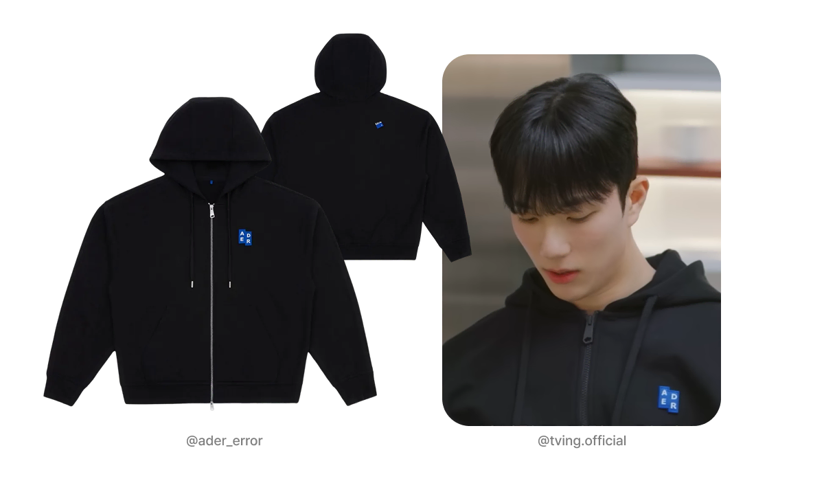 다음으로 소개할 아이템은 유식이 편안한 일상 룩으로 선택한 ‘시그니피컨트 후드 집업’입니다. 방송에서 숙소 내 휴식을 취하거나 가벼운 외출을 할 때 착용한 모습이 포착되었는데요. 군더더기 없는 시크한 블랙 컬러에 아더에러의 상징인 블루 사각 로고가 가슴에 더해져, 심플한 디자인 속에서도 브랜드의 정체성을 확실히 살렸죠. 탄탄한 소재감 덕분에 착용 시 흐트러짐 없이 깔끔한 실루엣을 연출할 수 있고, 지퍼를 끝까지 올려 입거나 티셔츠 위에 가볍게 걸쳐 입기에도 좋아 활용도가 높은 데일리 아이템입니다.