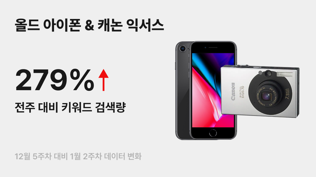 새해의 시작, 찰나의 순간을 나만의 감성으로 기록하려는 움직임이 돋보입니다. 쨍한 고화질 대신 흐릿하지만 따뜻한 색감을 지닌 ‘올드 아이폰’과 ‘캐논 익서스’ 디지털 카메라가 그 주인공인데요. 레트로 테크에 대한 꾸준한 관심이 이어지며, 일상을 빈티지한 무드로 남길 수 있는 디지털 기기를 찾는 수요가 급증했습니다. 실제로 번개장터 내 관련 키워드 검색량이 전주 대비 279% 증가하며 이러한 관심을 확실히 입증했어요.