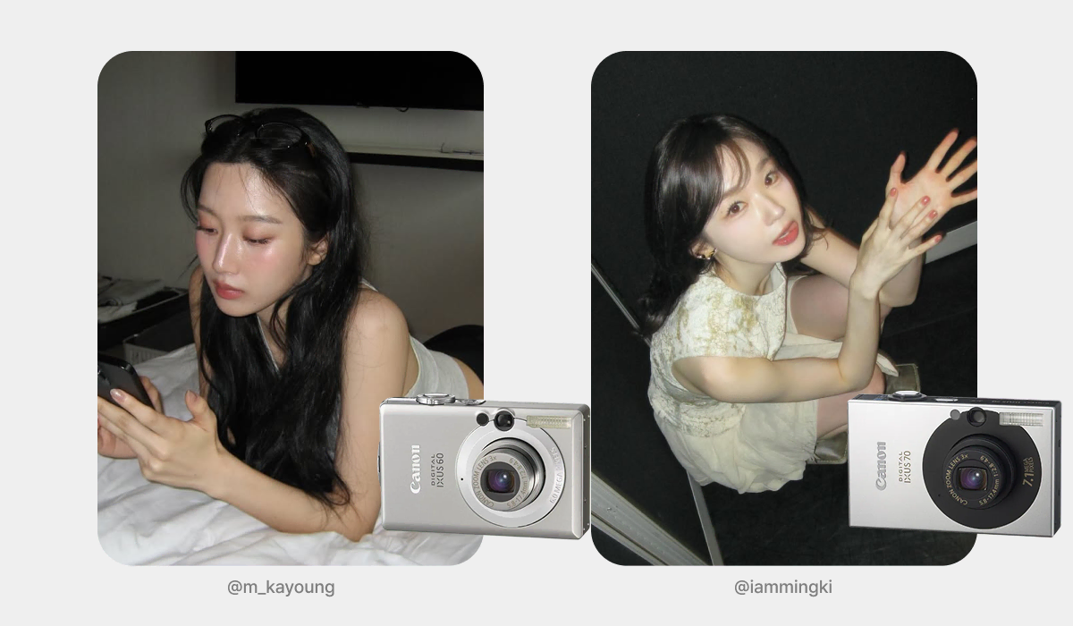 먼저 전주 대비 360%의 검색량 증가를 기록한 ‘익서스 60’ 제품인데요. 특유의 각진 실루엣 덕분에 레트로 디카의 정석으로 꼽히는 모델입니다. 채도가 낮고 차분한 색감을 지녀, 특유의 물 빠진 듯한 차가운 톤을 선호하는 분들에게 주목받고 있어요.