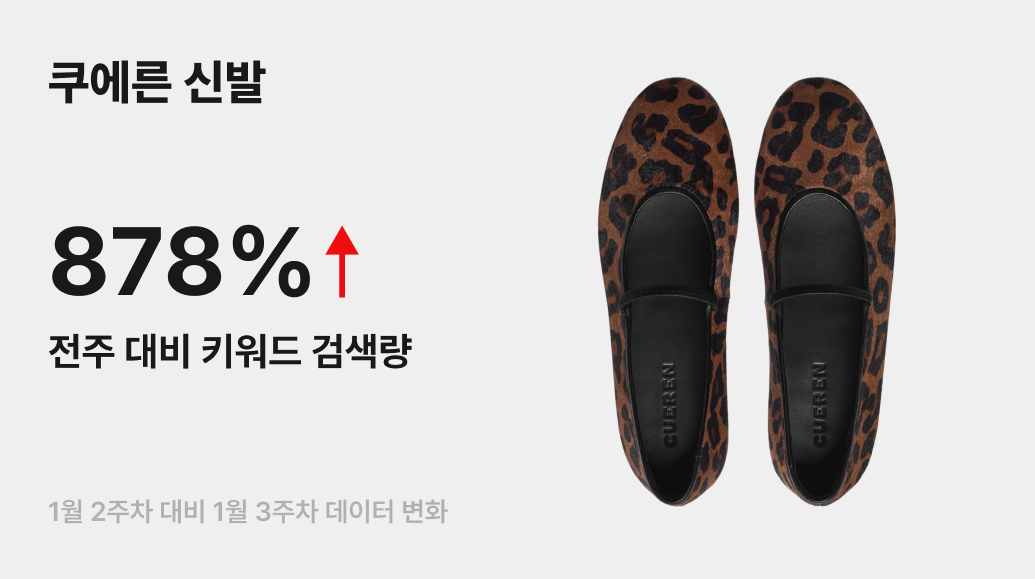 국내 컨템포러리 슈즈 신의 강자 쿠에른(CUEREN)의 기세가 예사롭지 않습니다. 천연 가죽 본연의 질감을 살린 고급스러운 디자인과 편안한 착용감으로 탄탄한 팬덤을 형성하고 있는데요. 이를 방증하듯, 금주 번개장터 내 ‘쿠에른’ 키워드 검색량이 전주 대비 무려 878% 증가하며 검색량 1위를 기록했어요.