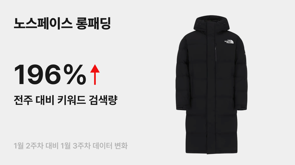 한동안 숏패딩에 밀려 주춤했던 ‘노스페이스 롱패딩’의 검색량이 전주 대비 196% 급증하며 역주행을 보여주고 있어요. 매서운 한파가 이어지며 보온성이 최우선인 필수 방한템으로서의 가치가 재조명된 것인데요.