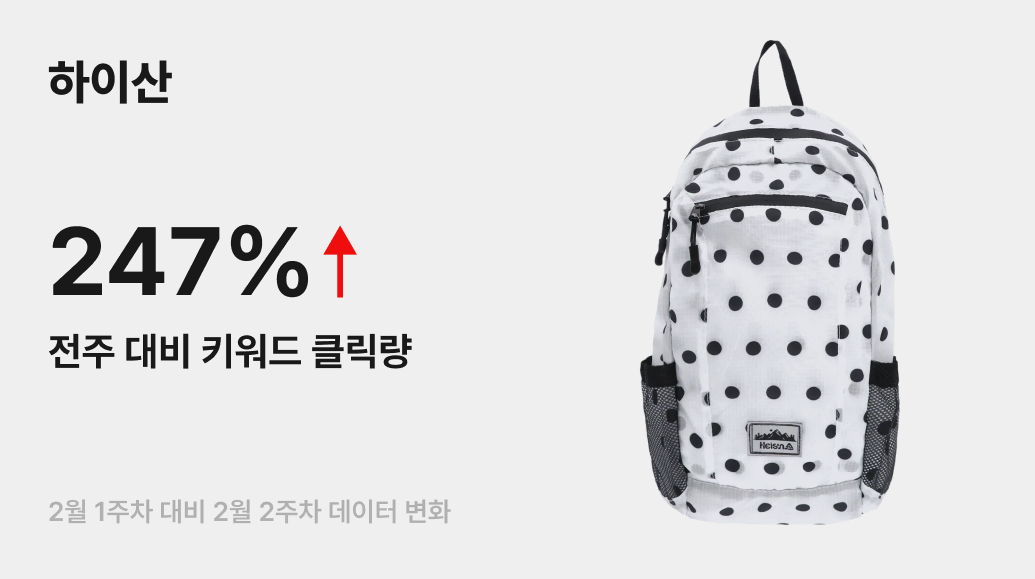 설레는 새 시작을 앞두고, 무거운 가방보다는 가볍고 산뜻한 무드의 백팩을 찾는 분들이 늘고 있습니다. 이러한 흐름 속에서 금주 번개장터에서는 키치한 감성의 라이프스타일 브랜드 ‘하이산(Heisan)’이 급부상했어요. 실제로 번개장터 내 관련 키워드 클릭량이 전주 대비 247%나 급증하며, 등교나 출근 등 평범한 일상 룩에 톡톡 튀는 포인트를 더해줄 가방에 대한 유저들의 취향이 데이터로 증명되었습니다.