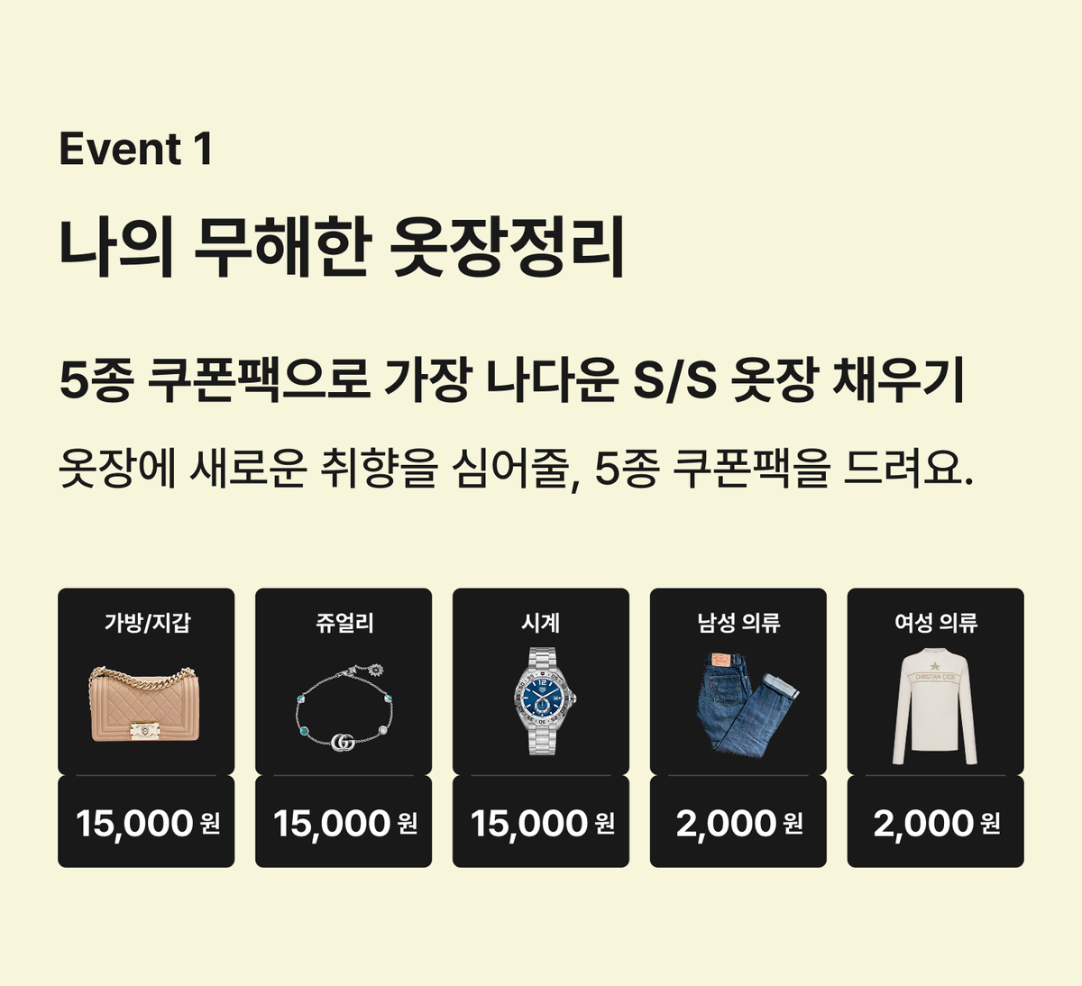 5종 쿠폰팩으로 가장 나다운 S/S 옷장 채우기: 옷장에 새로운 취향을 심어줄, 5종 쿠폰팩을 드립니다.