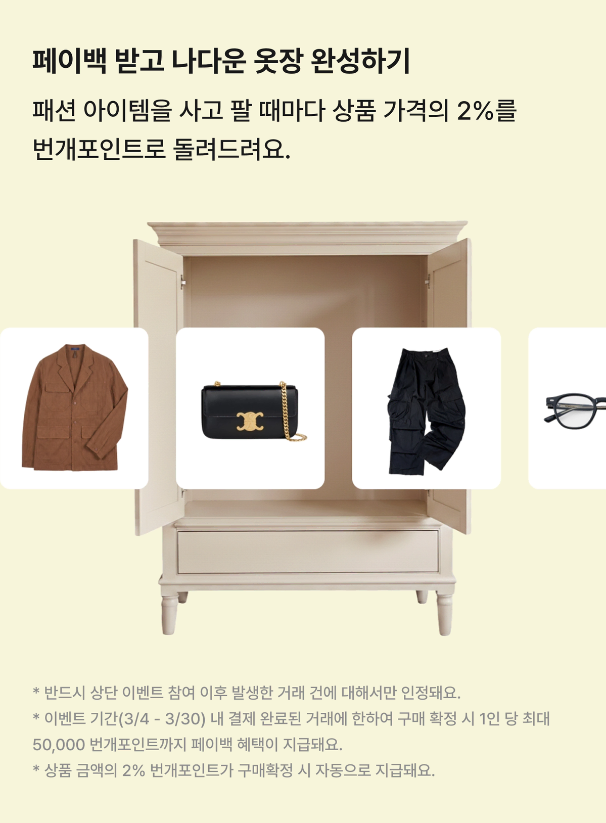 페이백 받고 나다운 옷장 완성하기: 패션 아이템을 사고 팔 때마다 상품 가격의 2%를 번개포인트로 돌려드립니다