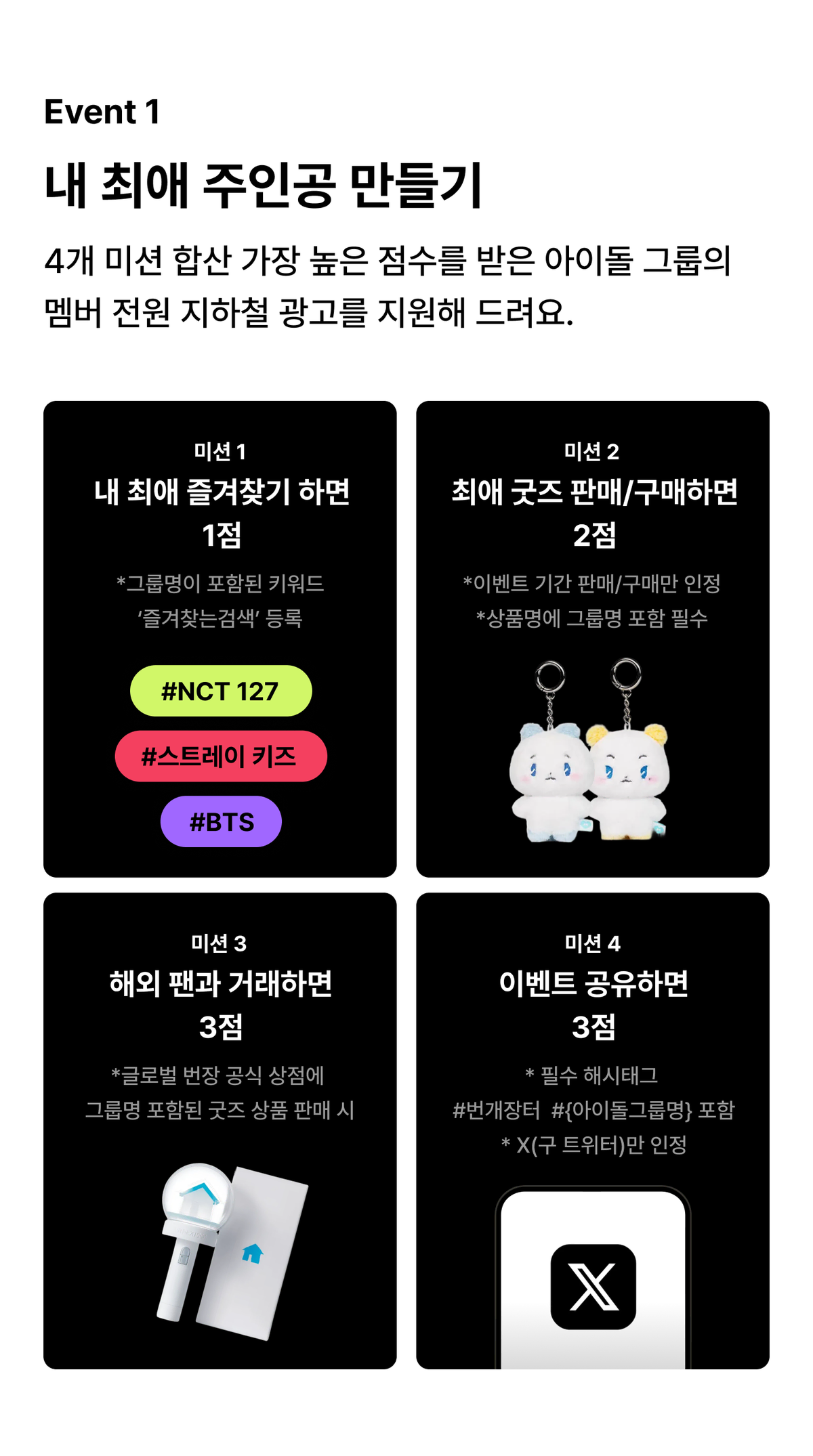 미션 4. 이벤트 공유하면 3점: X(구 트위터)에 필수 해시태그(#번개장터, #{아이돌그룹명})를 포함하여 이벤트를 공유합니다.