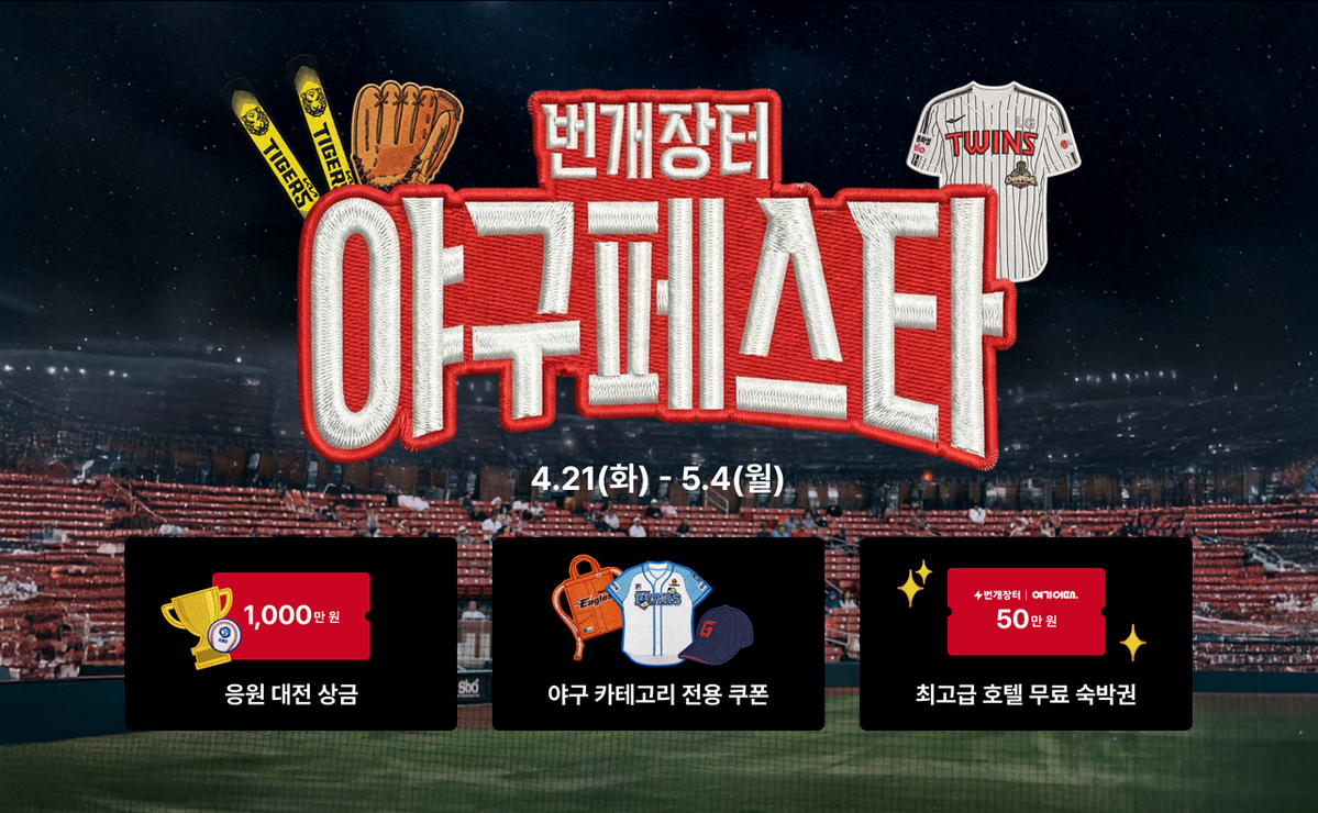 원정 응원을 즐기는 팬들을 위한 ‘직관 여행’ 지원 혜택도 풍성하다. 야구 아이템 거래 시 추첨을 통해 ‘여기어때’ 50만 원 숙박 쿠폰(10명)을 증정하며, 야구 카테고리 전용 쿠폰을 통해 팬들의 합리적인 쇼핑을 돕는다.