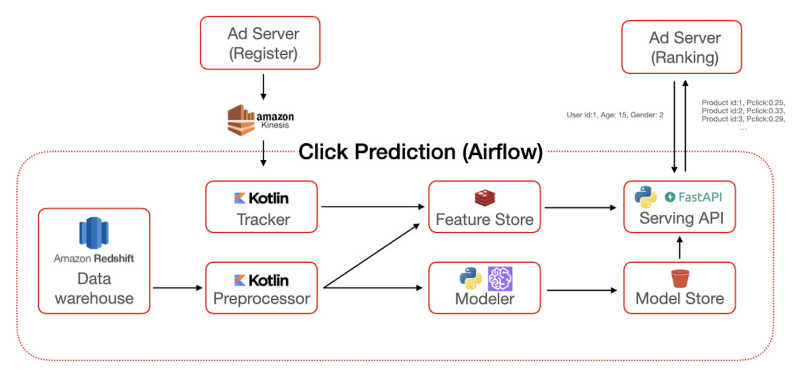 최종적으로는 제작된 학습 모델을 이용해 Serving API가 광고 서버에 전달해 주는 역할을 하게 됩니다. 여기서 특이점은 Serving 용도로 기존 Flask에서 FastAPI를 도입하였는데 여러 장점이 있어서 매우 만족스럽게 사용하고 있습니다. (자동 Swagger 스펙문서 구현, 간편한 파라미터 Validation 등)