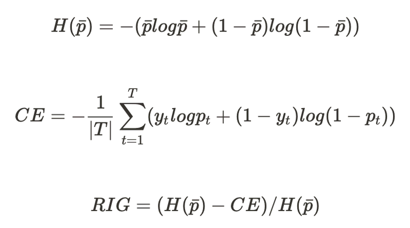 주로 논문들을 보면 AUC(Area Under ROC)와 RIG(Relative Information Gain)를 평가 지표로 사용합니다. AUC는 흔한 지표이니 생략하고, RIG에 대해서 잠시 말씀을 드리도록 하겠습니다. RIG는 베이스 Log loss(Entropy)를 기반으로 상대적 이득을 측정하는 방법입니다. Click(CTR) prediction 특성상 Log loss가 중요하기 때문에 Log loss의 감소는 모델 성능 향상에 있어서 매우 중요한 역할을 하게 됩니다.
