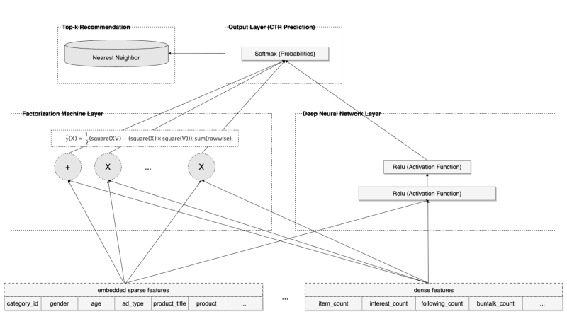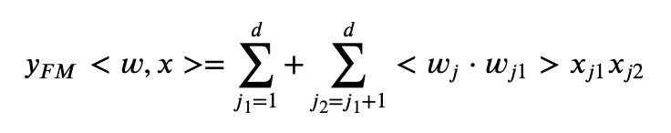 FM은 2010년에 Randle, S.에 의해 발표되었으며, 현재 번개장터 개인화 추천 시스템에서 활용 중에 있습니다. 빠른 연산 속도를 지니고 있는 것이 특징입니다. 진보화되어 Kaggle의 CTR prediction Competition (Criteo Co.)에서는 DeepFM이라는 이름으로 활약한 이력이 있습니다. 사실 FM의 장점은 수식을 아름답게 고쳐 빠른 연산속도를 만들어낸 것도 있지만, 고차원 Feature 간의 Interaction을 정교하게 계산 & 학습해 준다는 점도 큰 특징입니다.