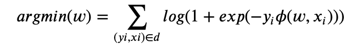 위는 Logistic Regression 최적화 문제를 풀기 위한 수식입니다. 𝑥𝑖는 Feature벡터, 𝑦𝑖는 클릭여부(레이블), d는 학습 데이터셋(인스턴스)을 의미합니다. 여기서 𝜙(𝑤,𝑥)=𝑤⋅𝑥 부분은 우리가 익히 알고 있는 선형모델이 됩니다. 최종적으로 최소의 w를 구하는 것이 목적이며 여기에 추가로 정규화(Regularization) 파라미터를 추가해 최적화를 진행할 수 있습니다.